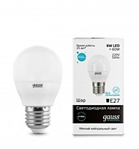 Лампа светодиодная E27 Gauss Elementary Шар G45 6W(450lm) 4100K 4K 82x45 матовая, пластик/алюм. 5322